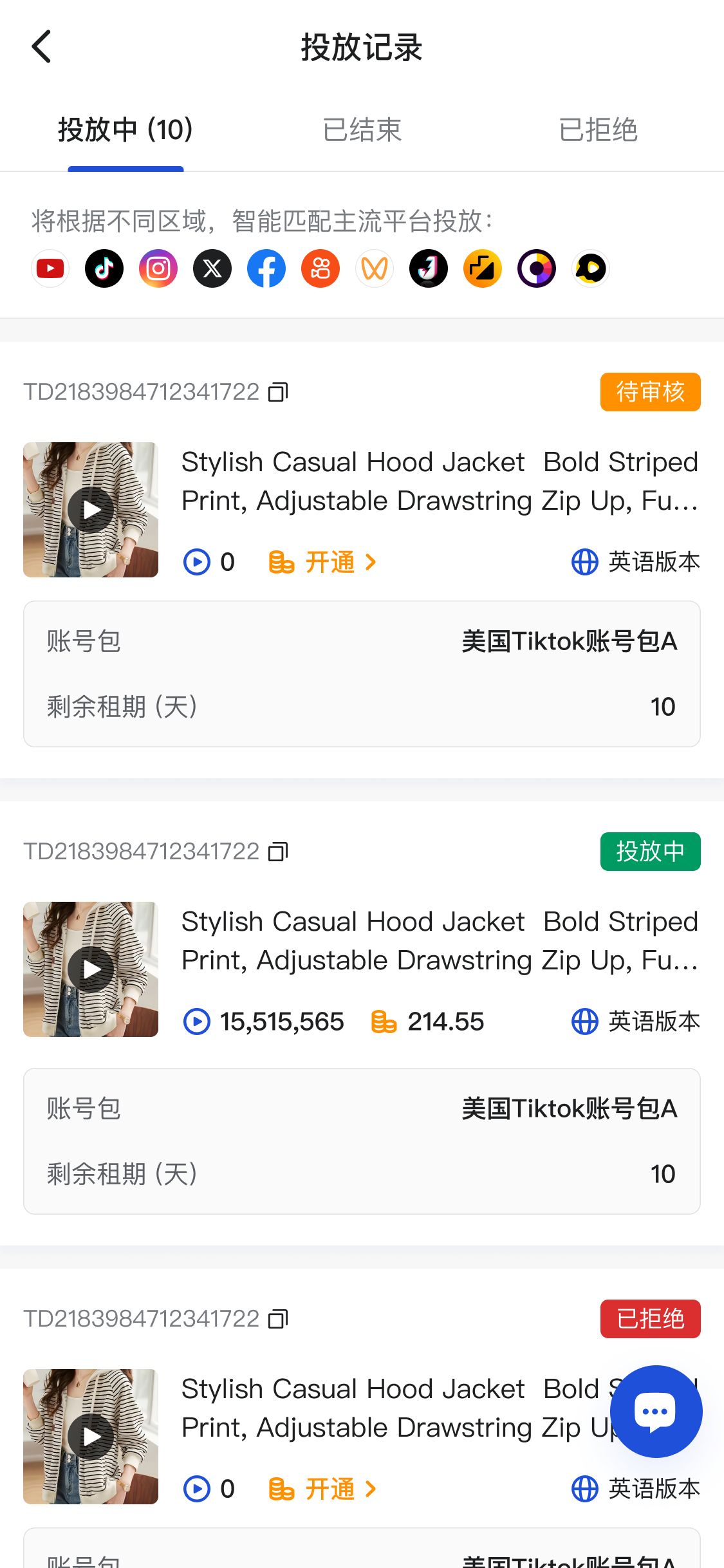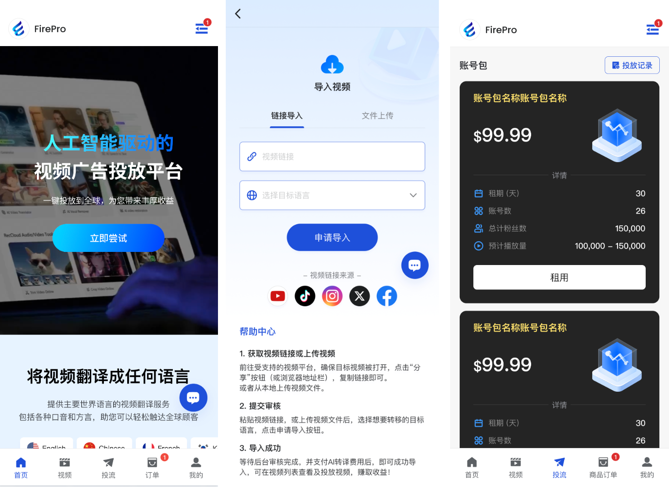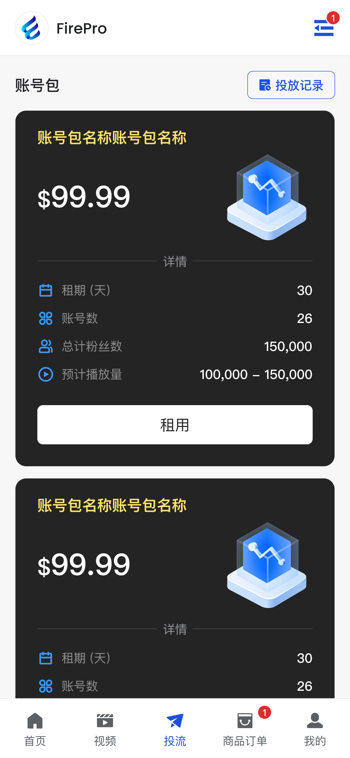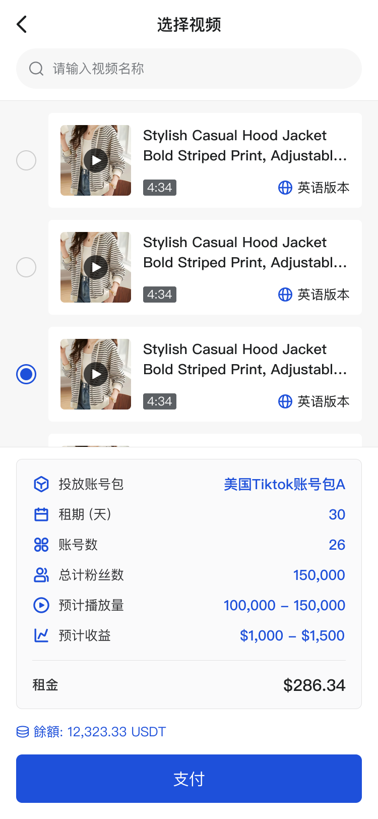 - 用户选择视频并下单租赁账号包后开始投放;