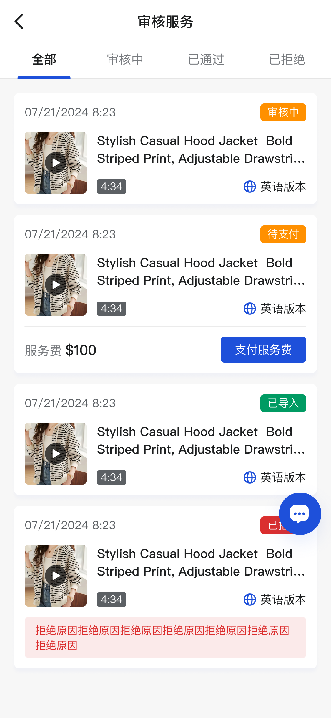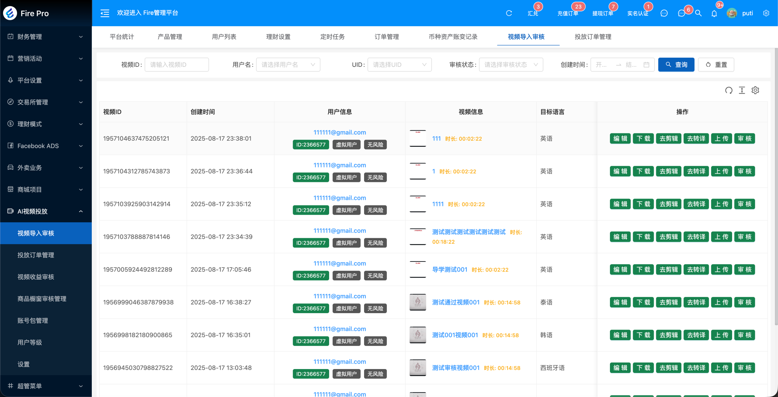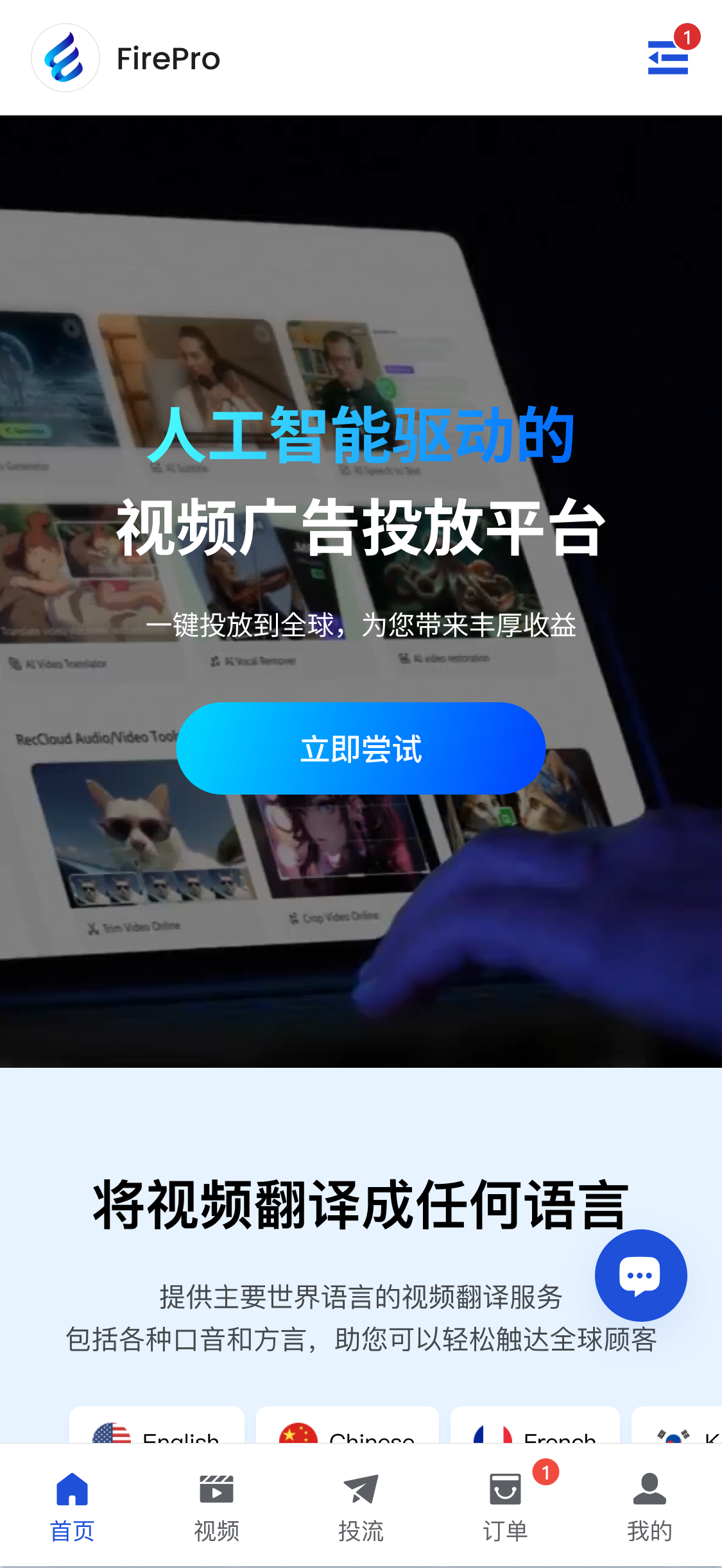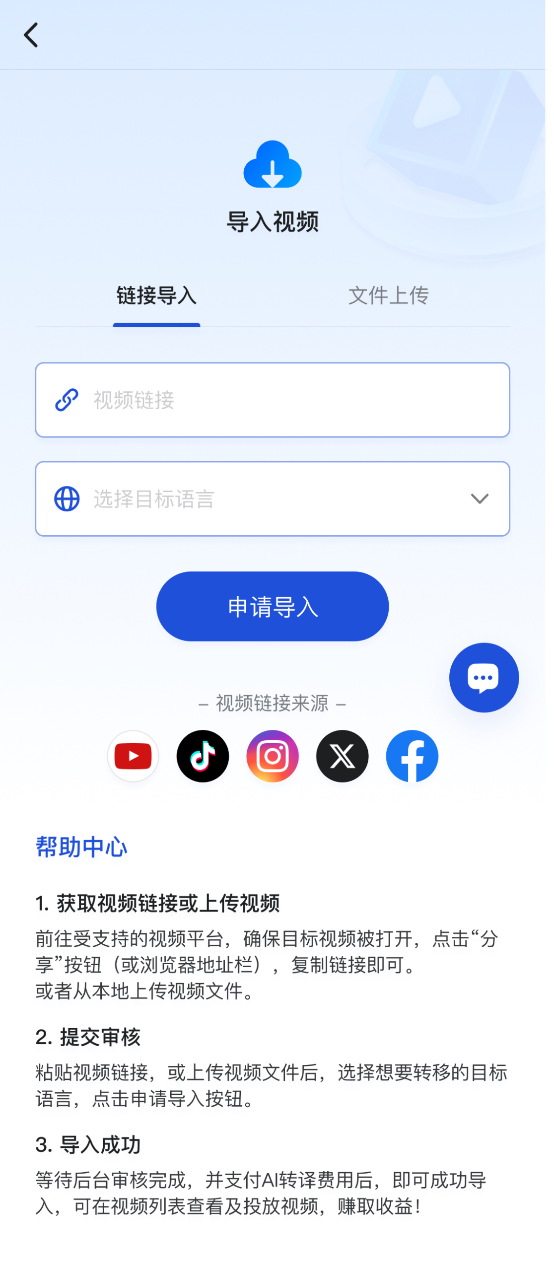 - 用户导入视频提交给AI翻译成其他语言(支持Tiktok、Youtube等主流视频平台链接解析,和本地视频上传);