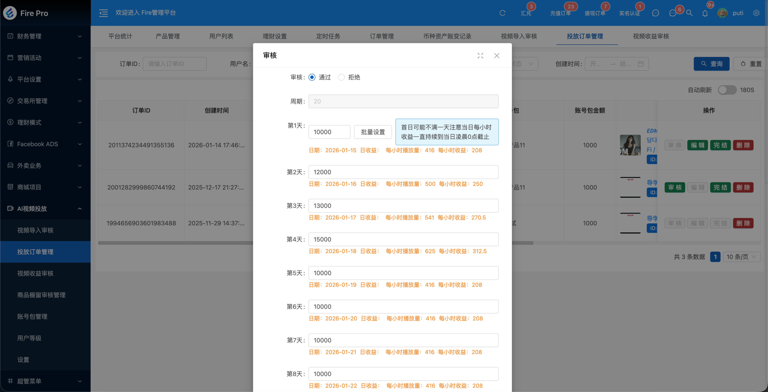 - 支持自定义投放订单在周期内的每日新增播放量;